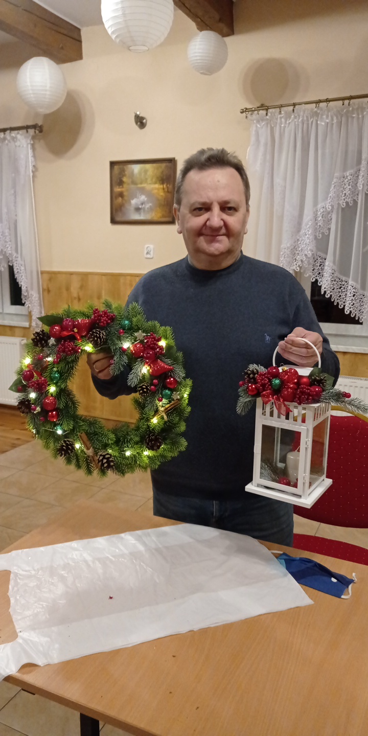 Z zachowaniem reżimu sanitarnego warsztaty odbywały się z podziałem na 5-osobowe grupy pod kątem pani instruktor. Wykonano piękne stroiki świąteczne oraz lampy przyozdobione elementami związanymi ze świętami Bożonarodzeniowymi.